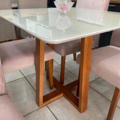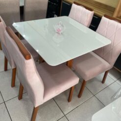 Esta deslumbrante peça destaca-se por um design moderno e elegante, exibindo linhas limpas e um toque de luxo. O tampo de vidro temperado acrescenta um brilho sutil, elevando a elegância da mesa. O canto arredondado não apenas contribui para a estética refinada, mas também aprimora a experiência de jantar, proporcionando conforto e segurança. Em harmonia com o tampo de vidro temperado, a base e as cadeiras de veludo, este conjunto cria um ambiente convidativo e belíssimo.