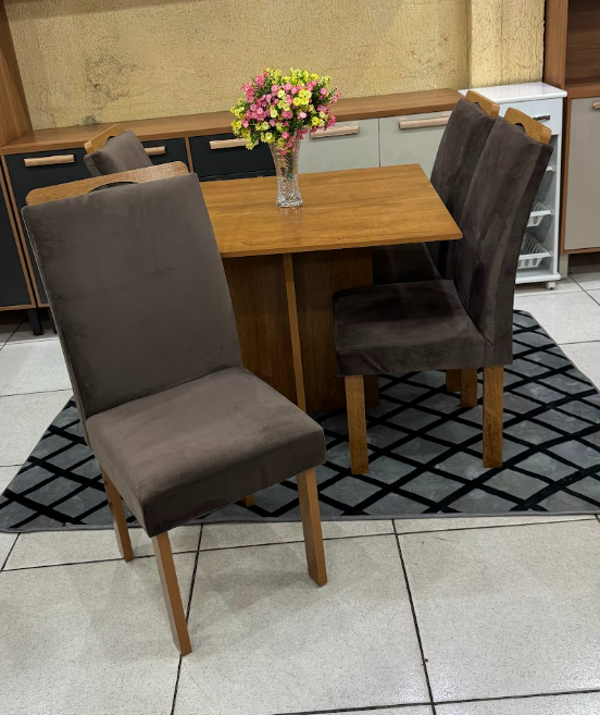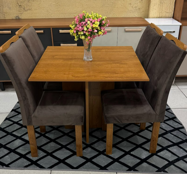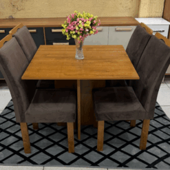 Compacto e funcional, se adapta muito bem a espaços menores, oferecendo um ambiente agradável para as refeições. As 4 cadeiras com acabamento marrom e assento confortável completam o conjunto com um toque de sofisticação. Uma opção moderna e encantadora para deixar sua sala de jantar ainda mais bonita e convidativa.