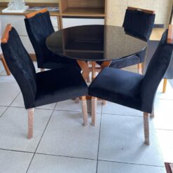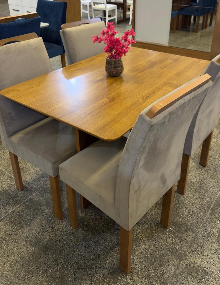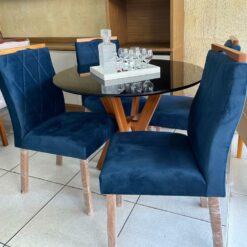 Compacto e funcional, se adapta muito bem a espaços menores, oferecendo um ambiente agradável para as refeições. As 4 cadeiras com acabamento marrom e assento confortável completam o conjunto com um toque de sofisticação. Uma opção moderna e encantadora para deixar sua sala de jantar ainda mais bonita e convidativa.