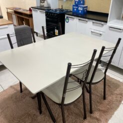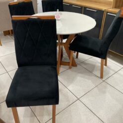 Compacto e funcional, se adapta muito bem a espaços menores, oferecendo um ambiente agradável para as refeições. As 4 cadeiras com acabamento marrom e assento confortável completam o conjunto com um toque de sofisticação. Uma opção moderna e encantadora para deixar sua sala de jantar ainda mais bonita e convidativa.