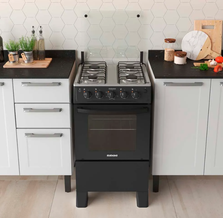 O Fogão Star New Plus da Itatiaia une beleza e praticidade no dia a dia da sua cozinha. Com design moderno e acabamento em preto, ele conta com 4 bocas bem distribuídas, ideais para preparar diferentes receitas ao mesmo tempo. O acendimento automático garante mais rapidez e facilidade no uso, enquanto o forno espaçoso com vidro amplo permite acompanhar o preparo dos pratos com mais visibilidade e segurança.