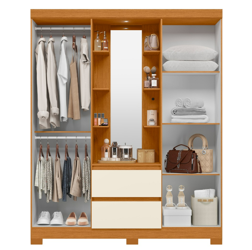 Os pés elevam o guarda-roupa, ajudando na limpeza e deixando o ambiente mais leve. Um modelo prático, confortável e com um design que faz diferença no seu quarto.