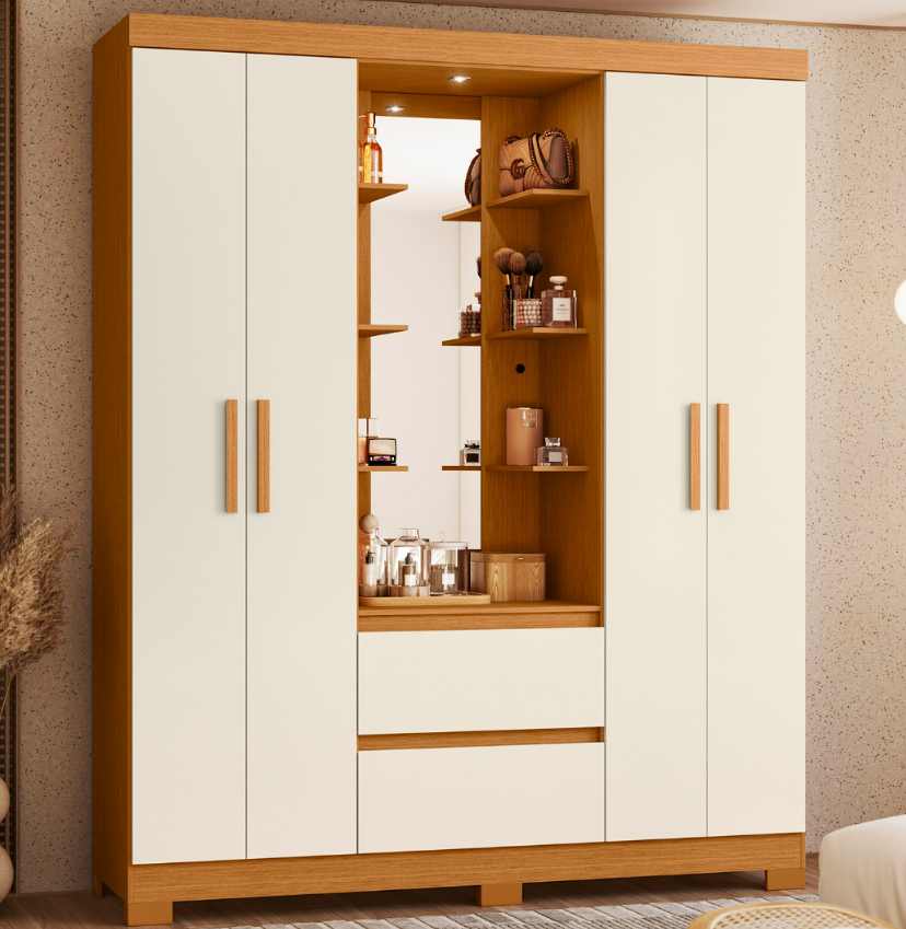O Guarda-Roupa Casal Olímpia é a escolha certa para quem quer um quarto mais organizado e bonito. Com 4 portas e 2 gavetas, ele oferece um espaço bem distribuído para o dia a dia, facilitando na hora de guardar tudo. O destaque fica para o nicho central, que traz um visual moderno e deixa o móvel ainda mais funcional.