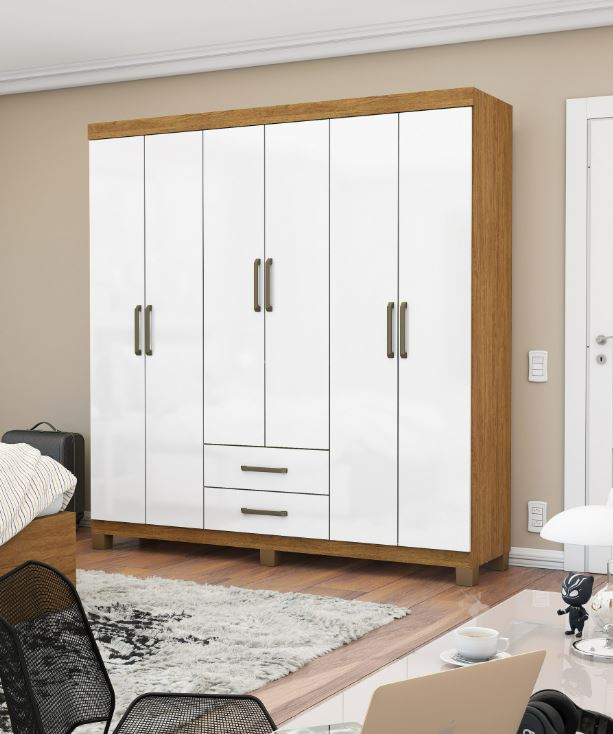 Guarda-Roupa Casal 6 Portas 2 gavetas com pés Áries – Cinamomo/ Branco