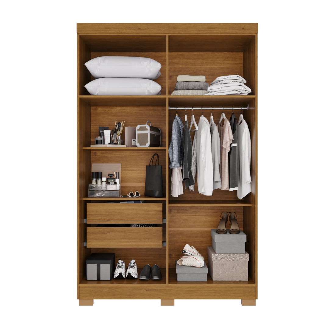 Sua estrutura oferece não apenas um bom espaço para guardar suas roupas, mas também uma organização eficaz. Com seis portas de bater, prateleiras, cabideiros e gavetas, ele permite fácil acesso a tudo o que você guarda no seu interior, mantendo seus pertences cuidadosamente ocultos e organizados de forma eficiente. Os puxadores madeirados adicionam um toque de classe ao design geral.