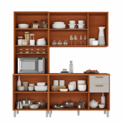 As portas contam com design atual e puxadores que dão um charme especial ao conjunto. O kit também possui nicho para acomodar perfeitamente o micro-ondas, deixando tudo prático no dia a dia. Um conjunto completo, prático e pensado para facilitar sua rotina enquanto destaca a beleza da sua cozinha.