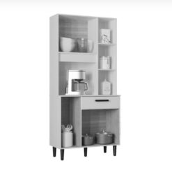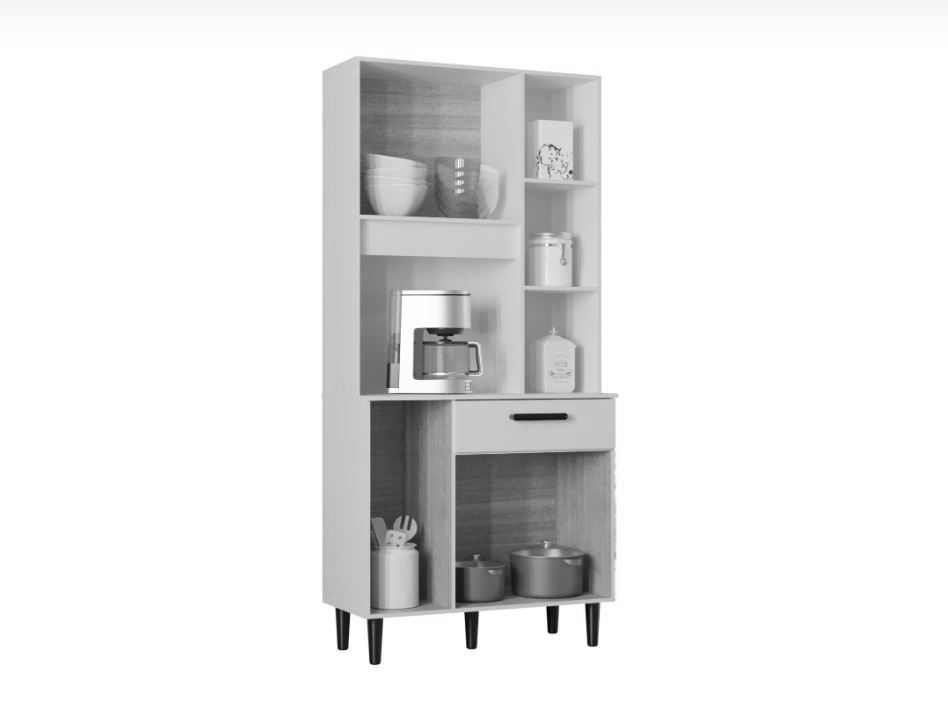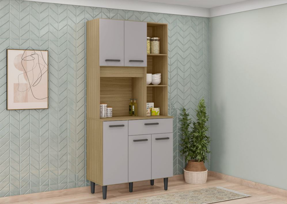 Com 5 portas e 1 gaveta, oferece um bom espaço interno para armazenar utensílios, mantimentos e pequenos eletrodomésticos. Seu design funcional conta com nichos abertos para expor tempeiros ou itens de uso frequente, além de um espaço central ideal para cafeteira ou micro-ondas. Compacto, é a escolha ideal para otimizar a cozinha.