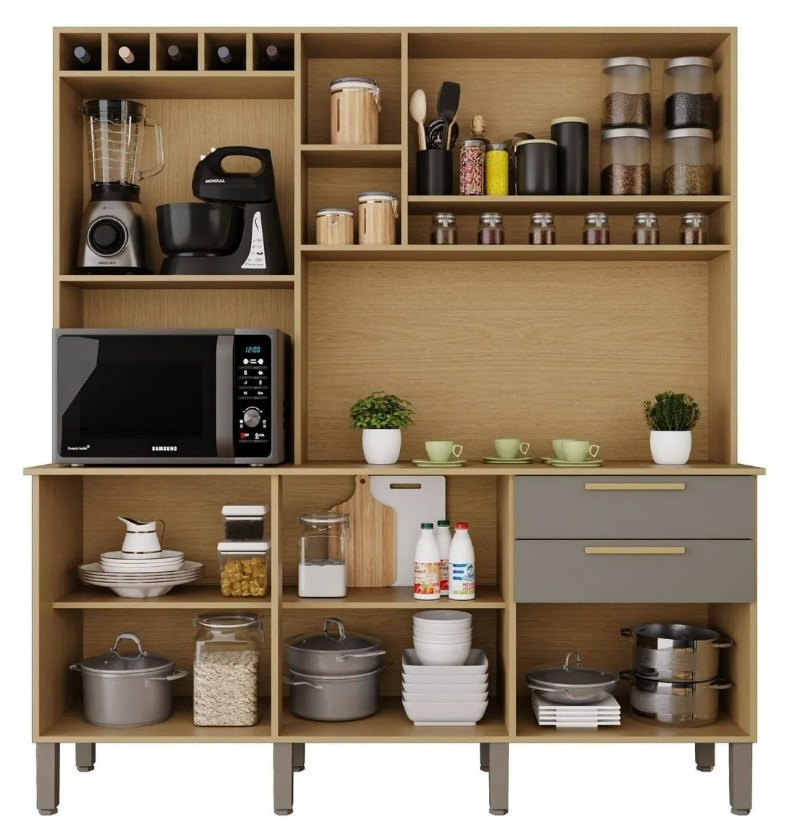 Com o armário Topázio sua cozinha vai ficar muito organizada, ele é ideal para cozinhas aconchegantes e que necessitam um ótimo aproveitamento do espaço, o conjunto possui inúmeras características para facilitar o seu dia a dia, como nichos para condimentos e acessórios, gavetas espaçosas para maior organização de seus utensílios, nicho para micro-ondas e várias prateleiras internas.
