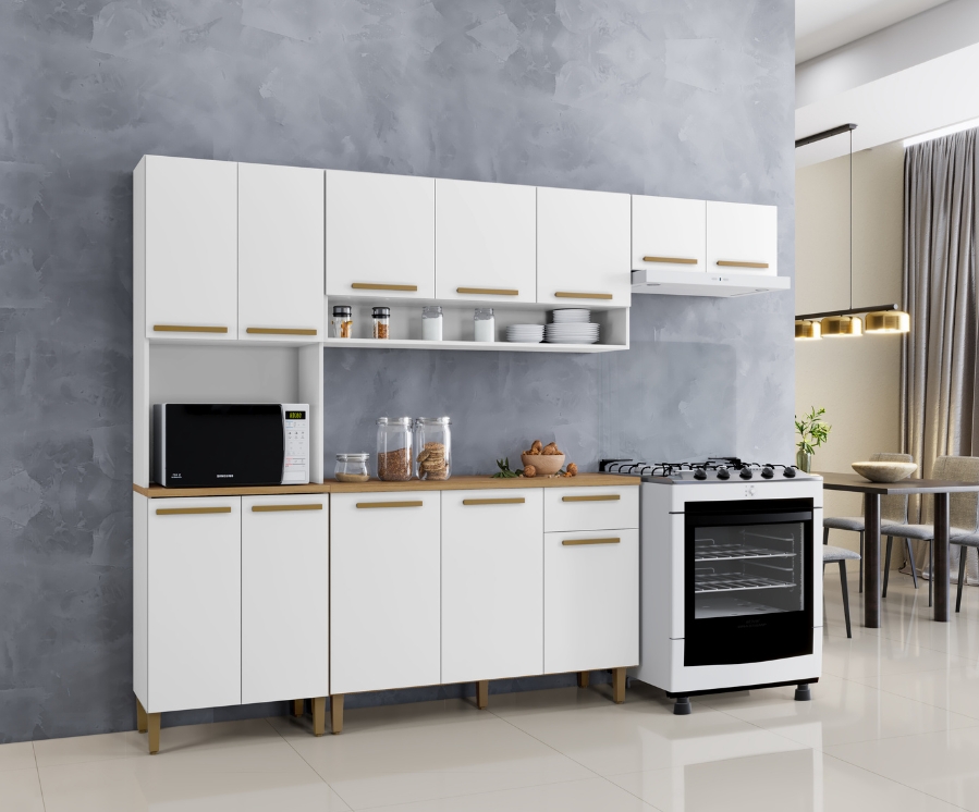 O kit é composto por paneleiro com nicho para micro-ondas, armário aéreo 3 portas com nicho, armário Aéreo Geladeira e balcão, formando uma combinação prática para compor sua cozinha com beleza e funcionalidade.