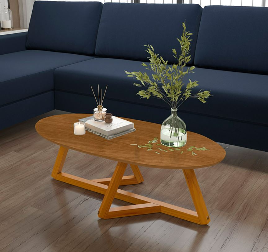 Com tampo oval em acabamento brilhante e base de madeira em formato geométrico, ela combina elegância e modernidade. Ideal para apoiar objetos decorativos, livros ou servir petiscos, se torna um ponto de destaque no ambiente, complementando a decoração com estilo e praticidade.