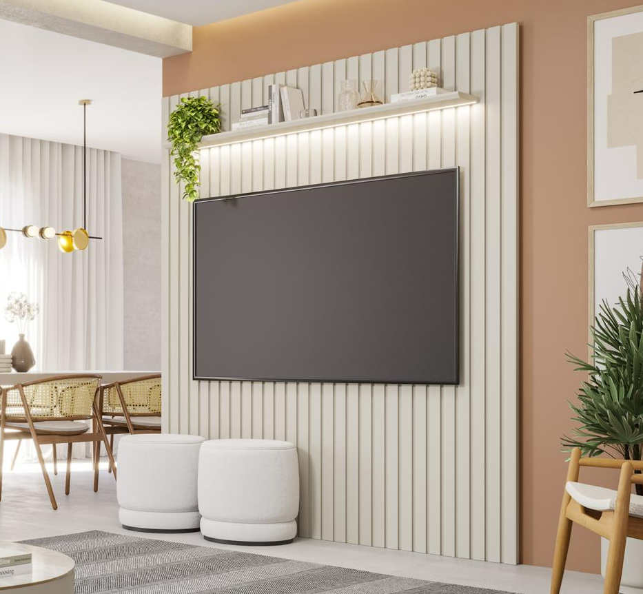 O Painel Home com LED Maragogi é puro destaque na sala! Com design ripado e iluminação em LED, ele traz um toque moderno e sofisticado ao ambiente.