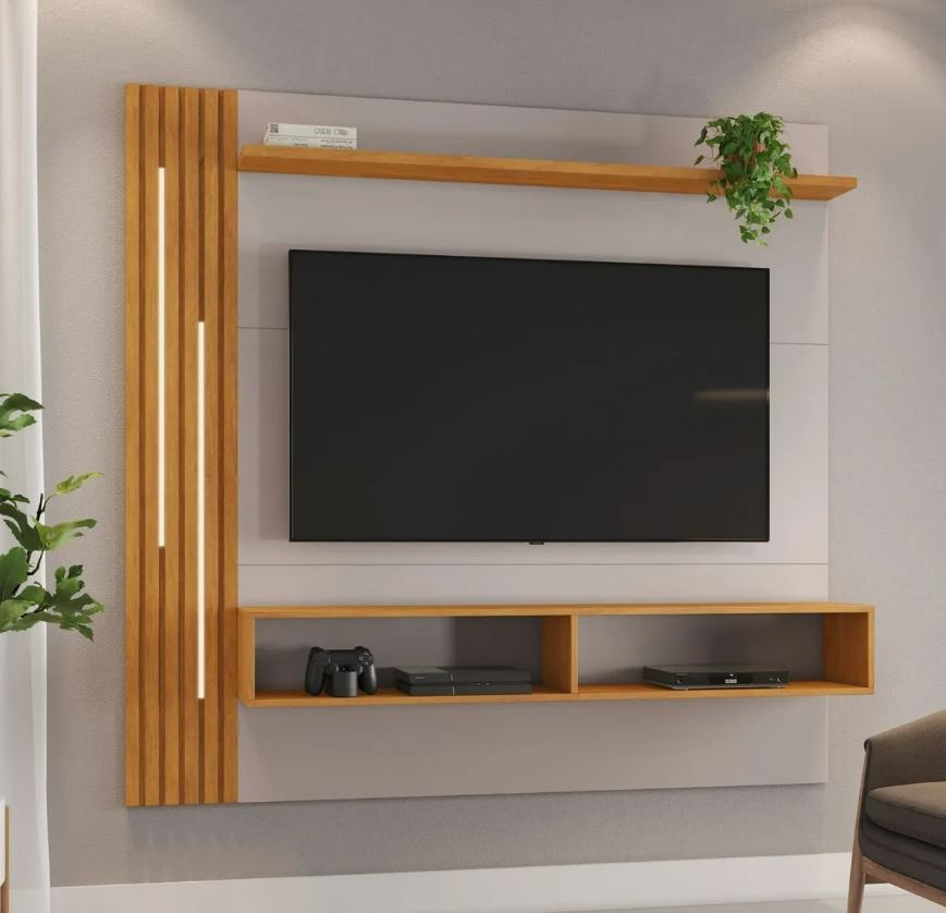 Com design moderno, destaque para o detalhe ripado com iluminação decorativa, que traz charme ao ambiente. A prateleira superior é ideal para objetos decorativos, enquanto os nichos inferiores acomodam aparelhos eletrônicos com organização. Um painel que valoriza seu espaço e deixa tudo mais bonito para curtir seus momentos de lazer.