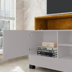 Ideal para TVs de até 48 polegadas, conta com nichos abertos para eletrônicos e uma porta com puxador em destaque, que ajuda a manter o ambiente organizado. O contraste de cores valoriza o design moderno, enquanto os pés elevados facilitam a limpeza no dia a dia.