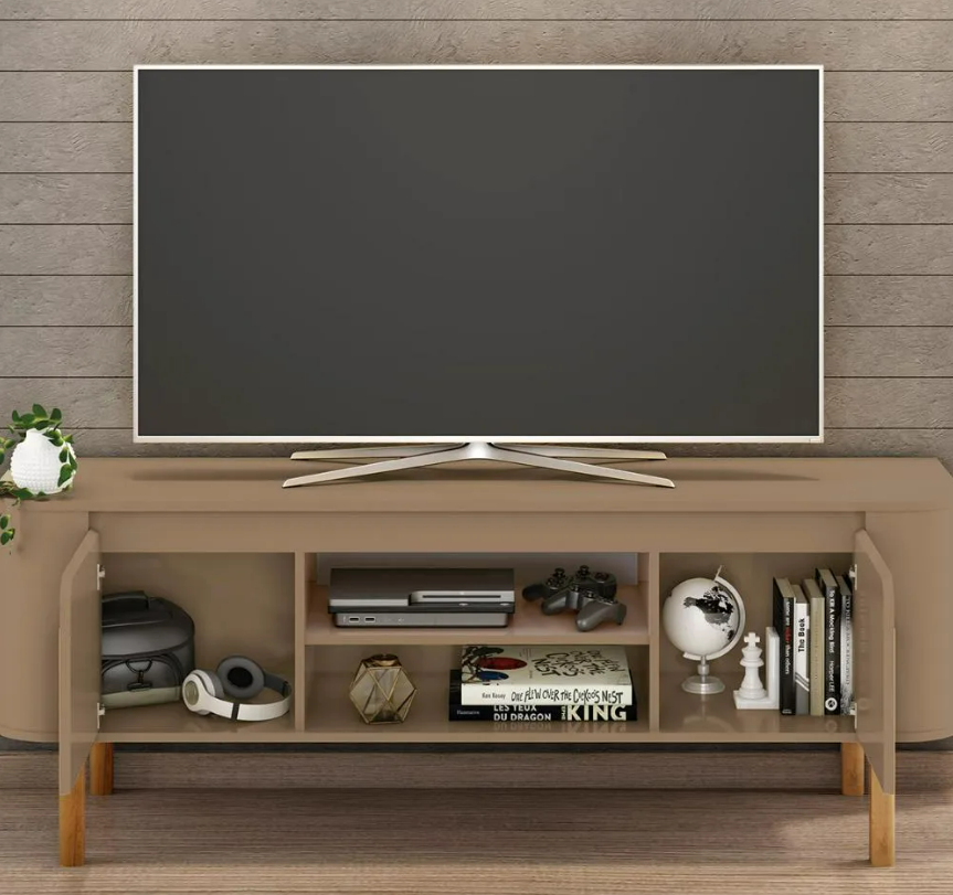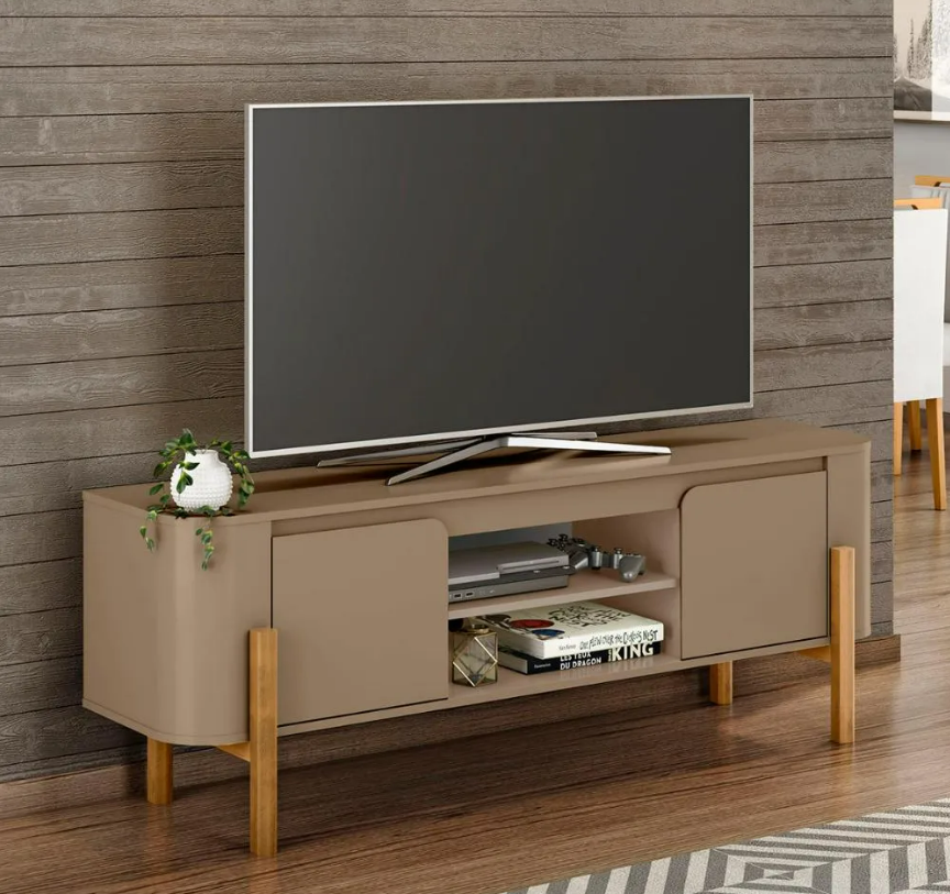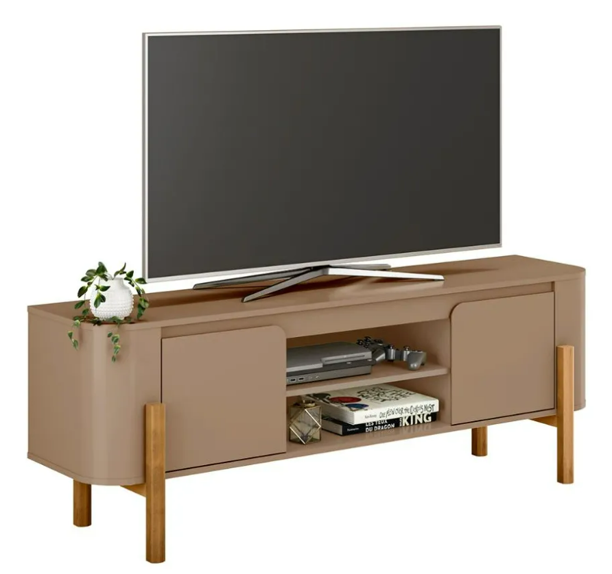 Com espaço para TVs de até 65 polegadas, ele conta com duas portas laterais que ajudam a manter o ambiente organizado, além de nichos centrais perfeitos para eletrônicos ou itens decorativos. Seu visual moderno com cantos arredondados e pés em madeira garante um toque de elegância ao ambiente. Um móvel funcional e charmoso que valoriza qualquer decoração.